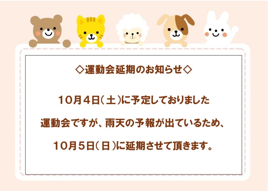 明日(10月4日(土))予定しておりました運動会ですが、雨天予報の為10月5日(日)に延期させて頂きます。どうぞ宜しくお願い致します。