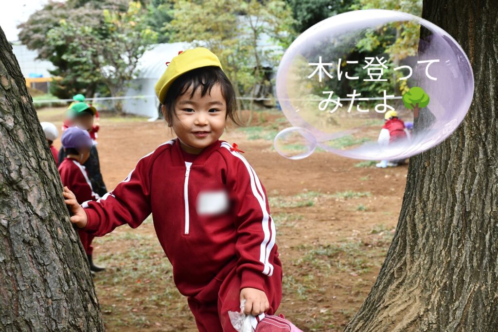 お昼ごはんをクラスみんなで食べたあと、木の実を見つけたり、木に登ってみたりして遊びました♪
