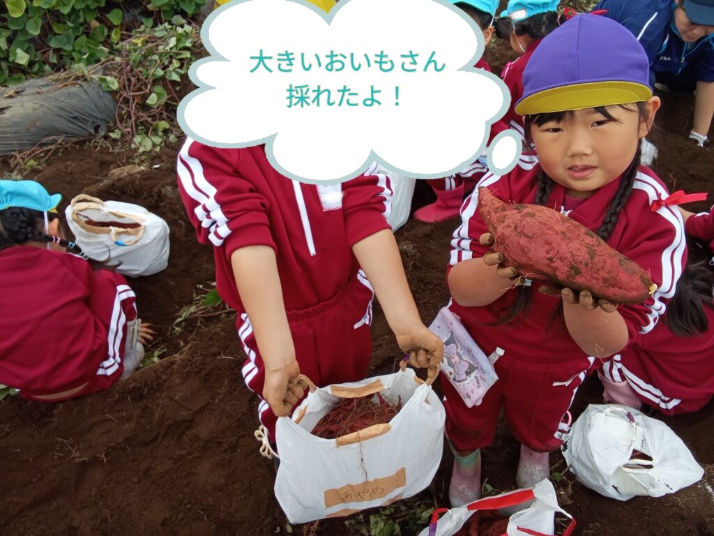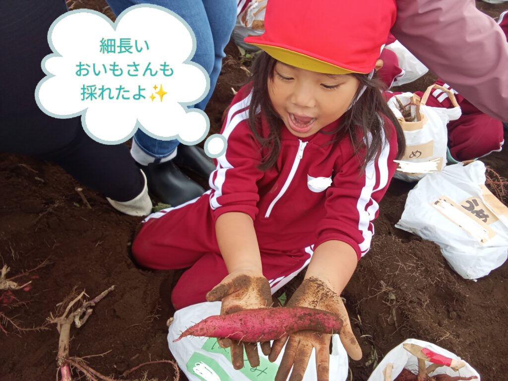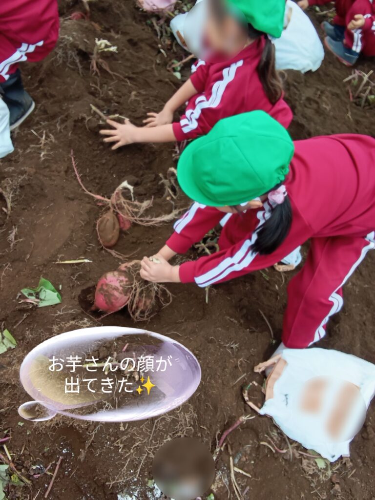 「おいもさんどこかな?見つけるぞ!」という声も上がり、土を掘り分けたツルを引っ張ってみると大きなおいもさんたちに会えました!