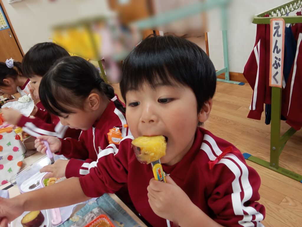 出来上がった焼き芋を食べてみると、「甘くて美味しい!」と言っていたり、何度もおかわりする姿が見られました♪