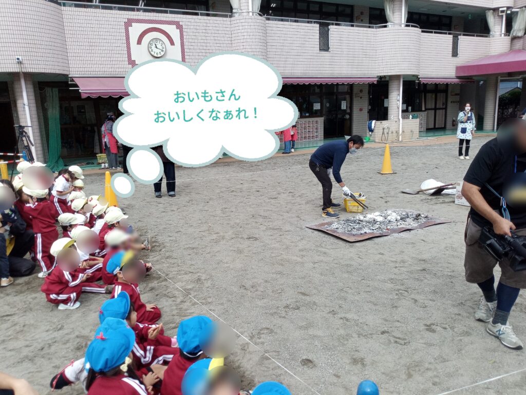 そして数日後、お芋掘り遠足で収穫したお芋を熱々の鉄板の上に置いて、温かい焼き芋さんに大変身しました!