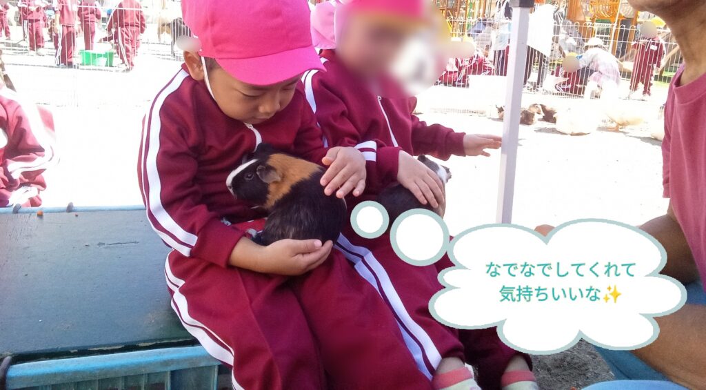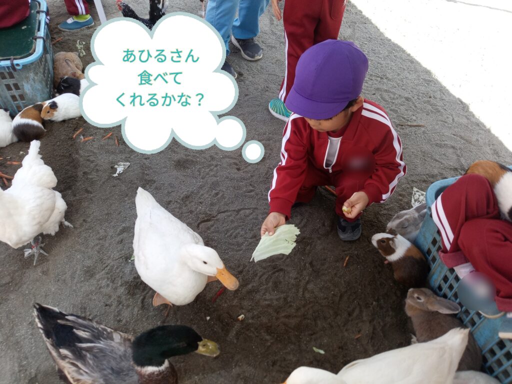 子ども達は少しドキドキしている様子も見られましたが、動物さんがエサを食べてくれたり、触れ合えたりした時には嬉しそうな表情を浮かべていました。