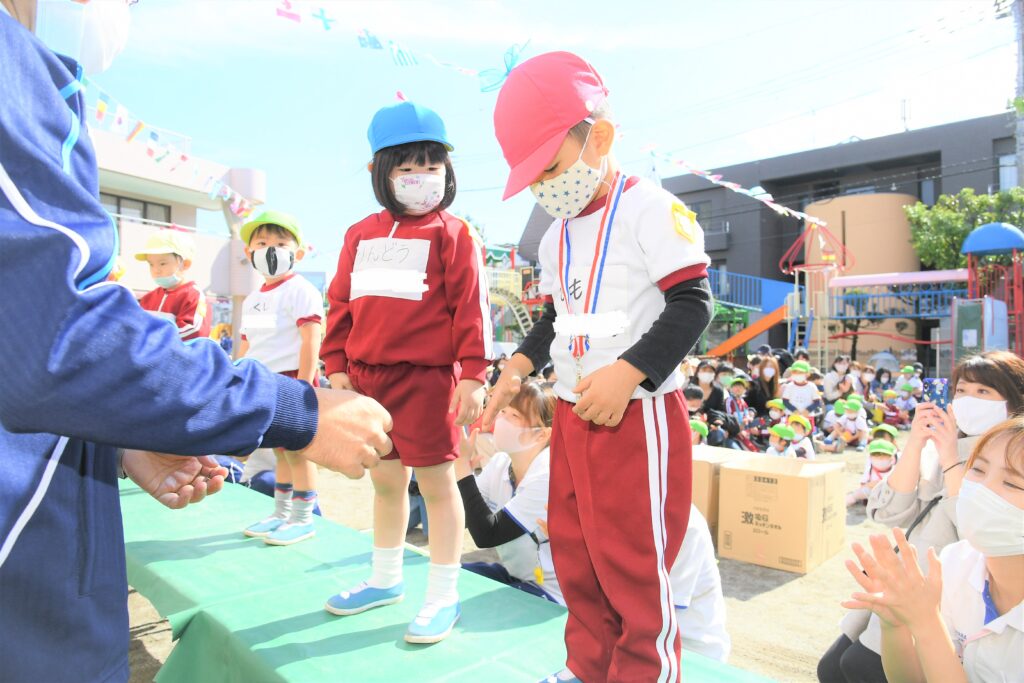 今年の運動会は、学年ごとに園内で実施致しました。年少さんはかけっこと玉入れ。年中さんはかけっことコスモバルーン。年長さんは鼓笛隊・鳴子踊りとリレー。感染予防のためそれぞれ限られた時間ではありましたが、子ども達の頑張る姿を保護者の方にご覧頂く事が出来嬉しく思います。子ども達も保護者の方や先生から沢山褒めてもらい次への意欲や自信に繋がったことと思います。